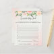 Cette carte de jeu pour baby shower présente de belles roses et pivoines à l'aquarelle pastel dans des nuances de rose blush et de pêche avec des feuilles botaniques vertes luxuriantes et de l'eucalyptus.