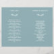 Programme de service commémoratif moderne imprimé sur une feuille de papier que vous pliez vous-même. Le programme funéraire présente la photo de votre être aimé à l'intérieur d'une couronne blanche dessinée à la main sur un arrière - plan bleu colombe.