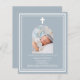 Arrière - plan bleu Dusty, décoré d'un cadre blanc, et d'une croix blanche Personnalisez et ajoutez un nom photo et des détails. Texte blanc. Cadre photo en forme d'arc. 1 feuille = 1 invite imprimé bord à bord.