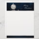 Illustration de Noël élégante : boule de Noël argentée et perles blanches sur un arrière - plan de livre bleu foncé.