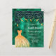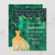 Une invitation moderne, élégante et glamour pour une Quinceañera, 15ème anniversaire. Un arrière - plan vert émeraude clouté avec un faux or une robe et des roses verts, des fleurs. Le nom est écrit avec un script de style moderne écrit à la main. Personnalisez et ajoutez les détails de votre fête. 1 feuille = 1 invite imprimé bord à bord.