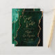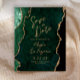 Ce mariage élégant sauvegarder la carte date dispose d'une image arrière - plan d'aquarelle vert émeraude parée de parties scintillant en faux or. Le texte personnalisable combine écriture manuscrite moderne couleur or, cuivre et polices italiques. L'envers présente un design coordonné vert émeraude et or agate.