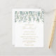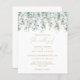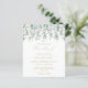 Un faire-part de mariage d'eucalyptus d'aquarelle botanique. Une élégante couronne verte d'eucalyptus décorée de feuillage doré et de éclaboussures est vue suspendue au-dessus du texte doré. Personnalisez en ajoutant tous les détails de votre événement.