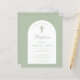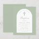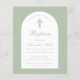 Une invitation de baptême moderne. Sur un fond vert sauge, il comporte une arche blanche avec un texte sage à l'intérieur. Le mot Baptême et le nom sont écrits dans une écriture calligraphique élégante ; la première ligne est un texte arqué.