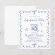 Définissez le ton pour une célébration joyeuse avec cette charmante invitation de fête de fiançailles avec un cadre ondulé bleu français, des rubans dessinés à la main et des lettrages en écriture ludique. Les verres à vin joyeusement levés ajoutent une touche amusante et festive, créant le mélange parfait de style romantique et fantaisiste. REMARQUE : ce papier économique est similaire en poids au papier photo -- une version plus grande et plus épaisse en carton traditionnel 5x7 est également disponible (envoyez-nous un message pour le lien).