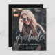 Faire-part moderne de graduation avec une photo verticale personnalisée. Le mot "diplômé" apparaît dans le faux script argenté, avec le nom du diplômé, l'école et l'année de graduation en bas en blanc sans serif police. Remplacez facilement l'image de l'échantillon par la photo de votre diplômé. Un écran de dégradé noir permet de s'assurer que le texte s'affiche. L'inverse est noir. Idéal pour obtenir un diplôme d'études secondaires ou collégiales.