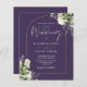 Cette invitation de mariage élégante et botanique avec feuilles de verdure peut être personnalisée avec vos informations en typographie chic avec vos initiales de monogramme au verso sur fond violet. Conçu par Thisisnotme©