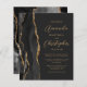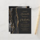 Le bord gauche de ce faire-part de mariage moderne élégant présente une bordure d'agate à l'aquarelle noire rehaussée de paillettes dorées fausses. Le texte personnalisable combine une écriture dorée élégante et des polices sans serif sur un fond noir ardoise. Le verso présente un dessin d'agate noir et or assorti.
