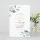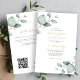 Élégante invitation de mariage bohème chic rustique botanique avec feuilles de eucalyptus vert sauge aquarelle, abordable et budget tous les détails sur votre site web avec calligraphie fausse dorée manuscrite et code QR à scanner pour RSVP en ligne.