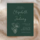 Cette invitation de mariage moderne présente un texte couleur crème sur fond vert foncé. Un dessin floral en ligne apparaît dans le coin inférieur gauche. Ajoutez les noms de la mariée et du marié dans un script manuscrit crème élégant et les détails dans une police sans empattement.