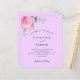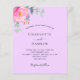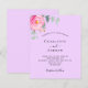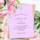 Un arrière - plan violet de couleur lilas. Décoré d'une floraison rose, de fleurs roses et de feuilles d'eucalyptus vert aquarellés, de sprigs, de verdure et de sprigs faux or. Personnalisez et ajoutez vos noms et les détails du mariage. 1 feuille = 1 invite imprimé bord à bord.
