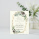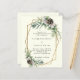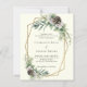 Pour un mariage d'hiver. Un arrière - plan en ivoire décoré de cônes, de baies blanches et de verdure. Un cadre géométrique en faux or. Personnalisez et ajoutez vos noms et détails. 1 feuille = 1 invite imprimé bord à bord.