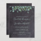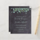 Invitez vos amis et votre famille à votre mariage avec ces cartes postales de faire-part de mariage rustiques et économiques à tableau noir et eucalyptus. Ces cartes d'invitation de mariage économiques ont une option d'enveloppe. Personnalisez avec les noms, la date du mariage, le lieu. Ajoutez toute autre information au verso. Ces invitations de mariage uniques avec verdure feront une impression durable, vos invités seront sûrs de sauvegarder la date ! COPYRIGHT © 2020 Judy Burrows, Black Dog Art - Tous droits réservés. Invitation de mariage économique avec verdure et eucalyptus