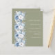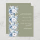 Un arrière - plan vert sage, décoré de fleurs bleu et blanc poussiéreux. Personnalisez et ajoutez vos noms et détails. 1 feuille = 1 invite imprimé bord à bord.