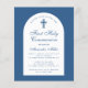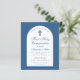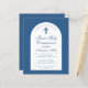 Une invitation moderne pour la première communion. Sur fond bleu classique, il comporte une arche blanche avec un texte bleu à l'intérieur. L'occasion et le nom sont écrits dans une élégante écriture calligraphique ; la première ligne est un texte arqué.