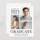 Faire-part moderne de graduation économique avec 3 photos, "Graduate" en grande typographie élégante et le nom de la diplômée, l'année de classe et l'école ou l'université en simple typographie.