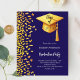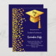 Une invitation moderne et élégante à Graduation Party. Un arrière - plan bleu foncé décoré de faux confettis d'or et une grande casquette de graduation dorée avec goût. Personnalisez et ajoutez un nom et des détails du parti. Texte blanc. 1 feuille = 1 invite imprimé bord à bord.