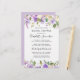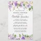 Très jolie combinaison de roses violets foncés, de roses violets clairs et de fleurs blanches en ivoire. Elles sont toutes nichées dans une variété de feuilles verts. Ensemble, ils créent des bordures florales le long du haut et du bas de cette invitation à la douche nuptiale. Le nom de la mariée est écrit en gros caractères.