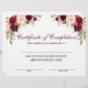 Professionnel, personnalisable, Certificat d'achèvement. Idéal pour les classes, les cours de formation, les écoles, les cours d'affaires et plus encore. Personnalisez avec votre texte personnalisé. Elégante aquarelle Bourgogne Floral aux roses bordeaux, roses roses roses et verdure botanique.