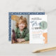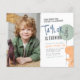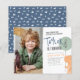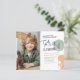 Une invitation de fête d'anniversaire abordable mettant en vedette un dinosaure dessiné à la main tenant un ballon. À l'intérieur du ballon se trouve l'âge du garçon qui fête son anniversaire. Le texte de l'invitation est tourné et aligné à gauche pour une mise en page amusante. Le haut de l'invitation indique "Piétinez, mâchez et rugissez. Faisons la fête comme un dinosaure !". En dessous, le nom de votre enfant est écrit dans une police de type écriture manuscrite. Les informations sur la fête sont écrites en bas avec un espace supplémentaire pour un message personnalisé. Sur le côté gauche de la carte, il y a une photo de votre choix. Une ligne blanche brossée sépare la photo du design. Les cartes se retournent sur un motif de formes organiques sur un fond bleu. La palette de couleurs de ce design est bleue, orange et verte. Parfait pour les enfants de tout âge ! Invitations d'anniversaire colorées sur le thème des dinosaures. Une version standard de cette conception est disponible dans ma boutique. Veuillez noter que, comme il