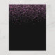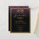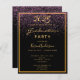 Une invitation moderne et élégante à une fête de remise des diplômes 2025. Glamour avec arrière - plan noir élégant et moderne et plume de confettis violet couleur violet. Avec un cadre en faux or. Modèle pour le nom et les détails de la fête. Le texte Graduation et le nom sont écrits avec un script de style manuel moderne. Lettres d'or. Dos : couleur arrière - plan noire, confetti