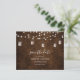 Magnifique bois sombre avec guirlande lumineuse et carte de sauvegarde de mariage en pots Mason. Les pots Mason contiennent de minuscules cœurs ainsi que des lumières. La typographie à l'écriture manuscrite a un rendu incroyable,