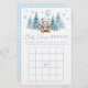 Jeu classique sophistiqué "Bingo" conçu pour une douche pour bébé garçon, orné d'un charmant ours en peluche portant un casquette et une écharpe bleu mignon, tenant un ballon bleu, entouré de pins d'hiver et de flocons de neige et motif en vichy bleu bébé à l'arrière. Engagez vos invités avec ce jeu délicieux, parfait pour ajouter du plaisir et de l'excitation à votre fête d'hiver tout en créant des souvenirs chéris.