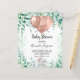 Pour un baby shower, célébrer une petite fille. Un arrière - plan blanc. Décoré de ballons d'or rose, d'une mignonne petite fille d'éléphant, de verdure d'eucalyptus et de mousseux verts. Personnalisez et ajoutez le nom de la mère à être le nom et les détails de la fête. Le nom et le texte : Baby shower sont écrits avec un script de style écrit à la main