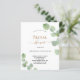 Un arrière - plan blanc décoré de sprigs de verdure d'eucalyptus. Personnalisez et le nom de la mariée à être et les détails du parti. Lettres noires et dorées. Retour : arrière - plan vert.