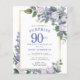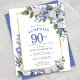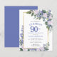 Honorer une femme spéciale avec cette invitation élégante et féminine pour une fête surprise de 90e anniversaire à petit budget. Surprise et 90e sont écrits en grand texte bleu. La célébration de l'anniversaire suit. Le nom de l'invité d'honneur est également en lettres capitales bleues. Les détails de la célébration de l'anniversaire sont entourés d'un cadre doré chic. Les fleurs bleues et les roses blanches sont nichées dans des feuilles vert foncé.