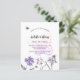 Un arrière - plan blanc à l'avant. Décoré d'abeilles et de fleurs sauvages peints en violet et rose et d'un grand papillon. Personnalisez et ajoutez un nom et des détails du parti. Retour : arrière - plan violet. 1 feuille = 1 invite imprimé bord à bord.