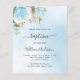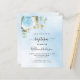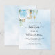Un ciel bleu en arrière-plan décoré de feuillage d'eucalyptus, une rose bleu clair et des feuilles dorées. Personnalisez avec le nom de l'enfant et les détails de la cérémonie. Lettres de couleur noire et dorée.