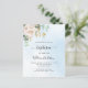 Un ciel bleu en arrière-plan décoré de verdure d'eucalyptus, une pivoine blanche, fleur et feuilles dorées. Personnalisez avec le nom de l'enfant et les détails de la cérémonie. Lettres de couleur noire.