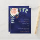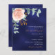 Un fond de couleur bleu marine. La couleur bleue est inégale. Décoré avec une fleur rose or et rose blush, une fleur de rose et des feuilles d'eucalyptus aquarellées vertes, des brindilles, de la verdure et une brindille dorée factice. Personnalisez et ajoutez vos noms et détails. Texte de couleur blanche et dorée.
