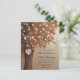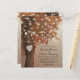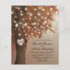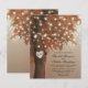 Cartes d'invitation de mariage vintage pas chères avec un arbre rustique aux feuilles rouges/orange, un cœur sculpté avec les initiales du couple, des guirlandes lumineuses et un modèle de mariage élégant facile à personnaliser.