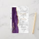 Le bord gauche de cette élégante invitation de mariage moderne présente une bordure d'agate aquarelle violette rehaussée de faux strass dorés. Le texte personnalisable combine une écriture manuscrite dorée avec des polices copperplate et italique noires sur un fond de marbre blanc et gris. Ajoutez des détails supplémentaires au verso, ainsi qu'un code QR pour aider les invités à visiter votre site web de mariage.