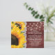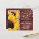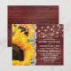 Invitations de mariage de campagne à budget comprenant un arrière-plan en bois de grange rustique, des tournesols jaunes, de la dentelle de mariée, des guirlandes lumineuses et un modèle de mariage élégant.