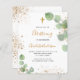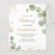 Un arrière - plan blanc décoré d'une végétation d'eucalyptus et d'une poussière de parties scintillant en faux or. Personnalisez et le nom des enfants et les détails de la cérémonie. Lettres noires et dorées. Non sexiste. Dos : arrière - plan blanc avec poussière de parties scintillant en faux or.