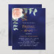 Un arrière - plan bleu marine. La couleur bleue est inégale. Décoré d'or rose et de fleurs roses rousses, de fleurs roses et de feuilles d'eucalyptus vert aquarellés, de sprigs, de verdure et d'une fausse feuille d'or. Personnalisez et ajoutez le nom de la mariée à être et les détails du parti. Texte blanc et doré. Retour : bleu marine arrière - plan inégal couleur. 1 feuille = 1 invite imprimé bord à bord.