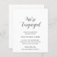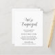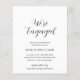 Cartes d'invitation de fête de fiançailles à budget noir et blanc contemporain avec une mise en page simple et minimaliste avec "Nous sommes fiancés" dans un script de calligraphie élégant. Un design moderne qui va bien avec n'importe quel style de fête de fiançailles.