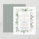 Une alternative à petit budget de format 4,5” x 5,6”. Disponible sur un papier cartonné SEMI-BRIOCHE de 110 lb qui est l'option par défaut (plus épais pour les invitations), OU sur un papier de grammage inférieur SATINÉ 80 lb (idéal pour les enclos). Les enveloppes sont une option supplémentaire et sont légèrement plus grandes que la taille de la carte. Pour les moments où vous ne pouvez pas être ensemble en personne, une fête de douche de mariage virtuelle est une bonne alternative. Ce design moderne a une bordure d'élégant feuillage vert sauge et or en aquarelle, autour d'une typographie stylée et simpliste que vous pouvez facilement personnaliser. Vous pouvez également modifier les couleurs du texte et de l'arrière-plan de chaque côté si vous le souhaitez via l'option Personnaliser davantage.