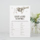 Jeu de Baby shower aux ours. Avec de mignons animaux de bois aquarelés peints à la main, ce jeu de baby shower est un choix idéal pour votre baby shower à thème forestier. On y trouve des oeuvres d'art magnifiquement fantaisistes avec des ours sauvages, des renards et des lapins. Trouvez les articles correspondants dans la collection de Baby showers de bois moderne 'Bearly Wait'. (Clé - 1. couche, 2. poussette, 3. sucette, 4. bébé, 5. précieux, 6. fauteuil roulant, 7. lit, 8. lait, 9. siège auto, 10. crèche, 11. préparation, 12. cigogne, 13. paquet de joie, 14. berceuse, 15. couverture, 16. chaise haute 17. douche, 18. ours en peluche, 19. bibb, 20. canard en caoutchouc)
