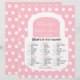 Vous cherchez un jeu de douche nuptiale en sac à main qui n'est pas comme tous les autres? Eh bien, celui-ci est pour vous ! Ce jeu de douche à la nuptiale porte un véritable design de sac à main en tant que plateau de jeu. Le porte-monnaie contient les mots "Qu'y a-t-il dans votre sac à main ?" et les participants à la douche nuptiale peuvent vérifier ce qui est dans votre sac à main et additionner les points totaux — tout à l'intérieur du porte-monnaie. Le sac blanc apparaît sur un arrière - plan à pois rose et blanc. Vous pouvez même customiser le design avec le nom de la mariée et la date de la douche nuptiale. C'est un tour amusant à la partie de la douche nuptiale à sac à main ! Copyright henishouseo