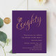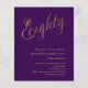 Une invitation design et moderne pour une fête du 80e anniversaire. Un arrière - plan de couleur violette et le mot Eighty écrit avec d'élégantes grandes lettres de script en faux or. Personnalisez et ajoutez un nom et des détails du parti. 1 feuille = 1 invite imprimé bord à bord.