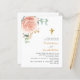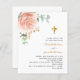 Pour la confirmation de 2 filles, soeurs. Un arrière - plan blanc décoré de verdure d'eucalyptus, de feuilles dorés et d'une fleur d'or rose. Personnalisez et les noms des filles et les détails. Lettres noires et dorées. 1 feuille = 1 invite imprimé bord à bord.
