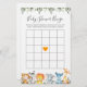 La carte de jeu baby shower de bingo à thème pour animaux de la jungle présente une illustration de safari d'aquarelle/animaux de la jungle et de la verdure d'aquarelle de la guirlande à eucalyptus et une police de style manuscrit élégante.