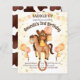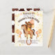 Mignonne petite cowgirl en peau brune selle à budget d'anniversaire modèle d'invitation. Femme à cheval de bébé mignonette avec ballons et drapeaux de bottes à l'arrière - plan. Couleurs Brown de la ferme jaune.