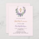 Arrière - plan rose. Une couronne fleurie faite de fleurs de lavande, une verdure d'eucalyptus aquarellée et une croix dorée. Personnalisez et ajoutez un nom et des détails. 1 feuille = 1 invite imprimé bord à bord.