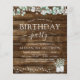 Cartes d'Invitation d'Anniversaire de Style Rustique Campagnard en Plein Air sur Bois Sombre avec Feuillage Eucalyptus et Coton avec des Pots sur Guirlande Lumineuse pour le Printemps, l'Été, l'Automne ou l'Hiver - comprend une typographie de script élégante et belle pour la célébration spéciale de la fête d'anniversaire.