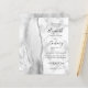 Le bord gauche de cette élégante faire-part de mariage moderne est orné d'une bordure en aquarelle grise et blanche ornée d'une parties scintillant en faux argent. Le texte personnalisable combine écriture manuscrite noire, copperplate et polices italiques sur un arrière - plan en marbre gris et blanc. L'envers présente un design d'agate gris et argenté assorti.